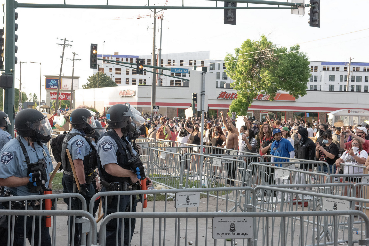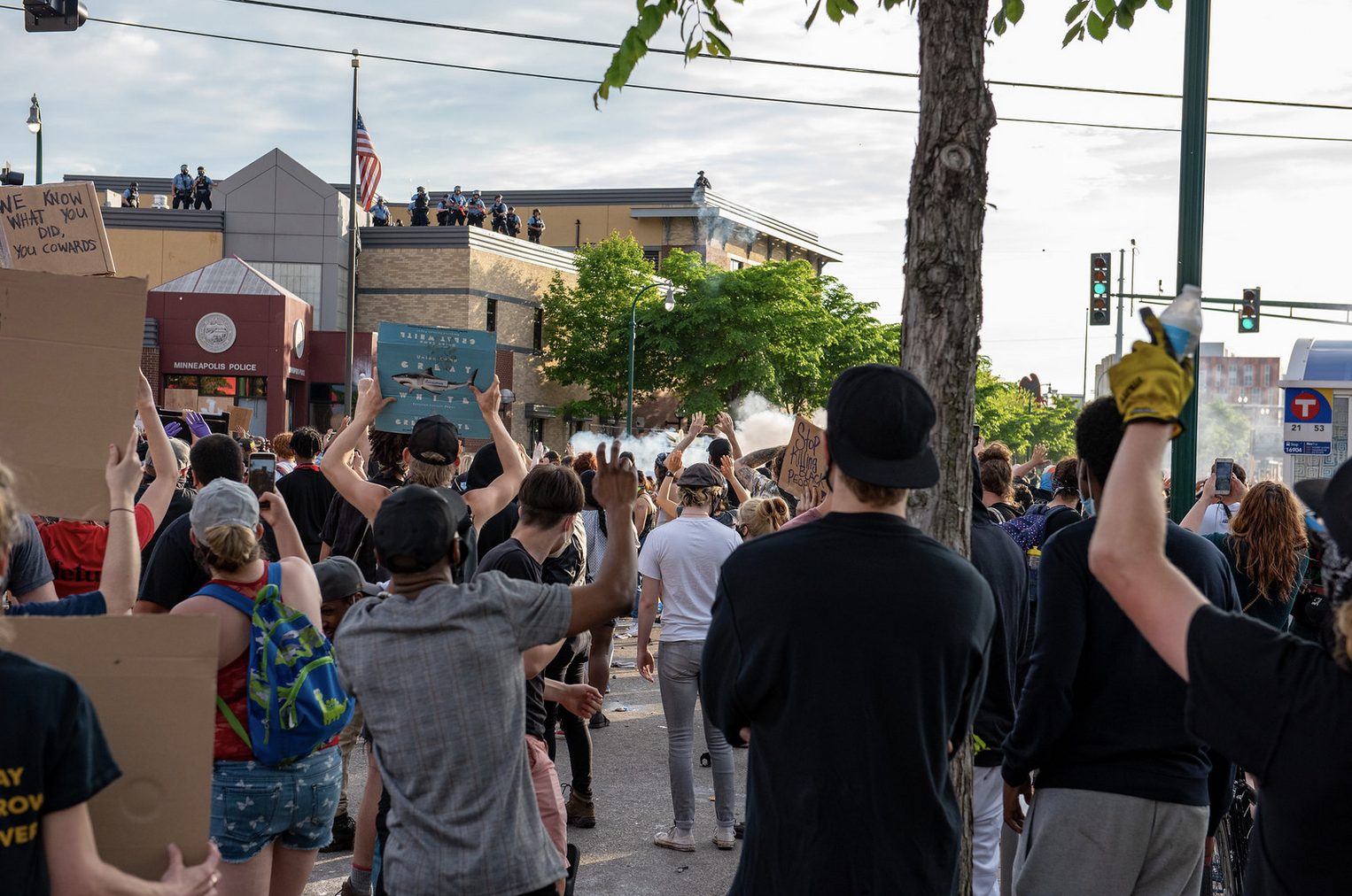 The next day protesters assembled outside the 3rd precinct once again, throwing up barricades in the streets and tossing rocks at the police station windows. Heavily armed police stood in front of the main entrance to the station with riot helmets, batons, pistols, and long rifles. Tactical units stood on high ground, along the roof of the precinct, shooting down at the protesters with less-lethal 40mm marker rounds, grenades, and tear gas.