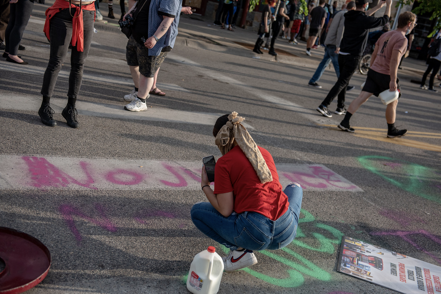 After days of civil unrest, the community began to regather and form a peaceful occupation at the site where George Floyd was murdered by police. There, community members can be seen handing out canned food, grilling BBQ, and discussing plans to abolish the police department.