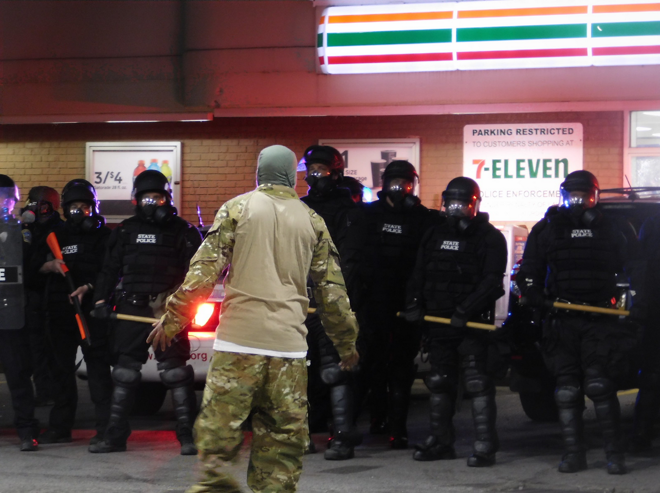 Groups of looters could be seen using electric saws on ATMs as others with pistols stood by and guarded the heists. During each nightly skirmish, lasers beamed back and forth between protesters and police snipers, while military UH-60 Black Hawk helicopters and Predator drones circled above the city.