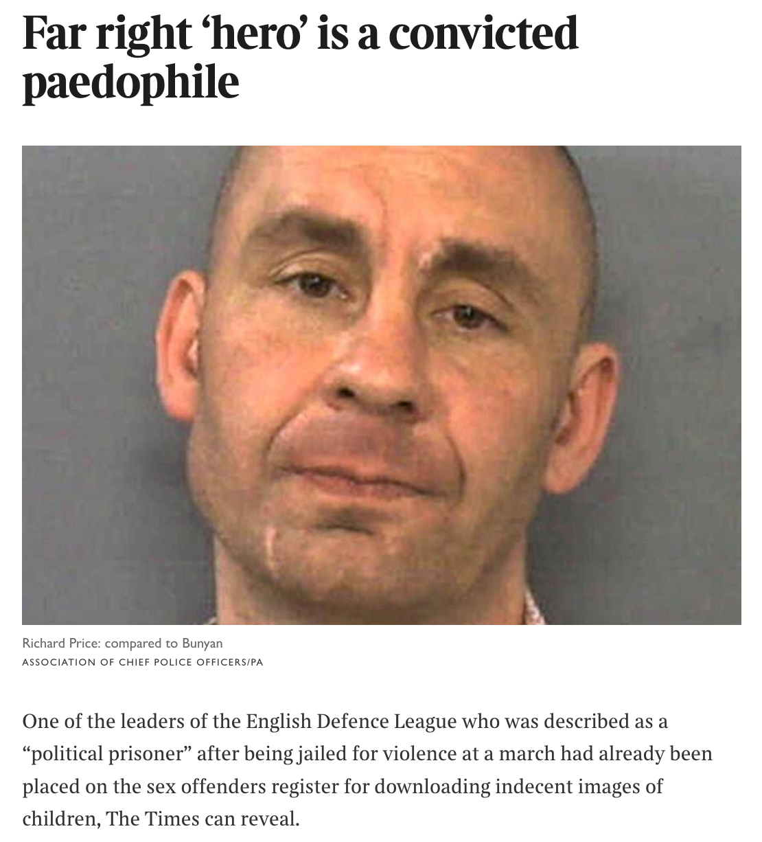 The other thing the far-right love to avoid talking about is the large numbers of paedophiles, sexual abusers and rapists within their own ranks. Famously, Richard Price, a co-founder of the EDL along with Tommy Robinson, was defended by Robinson when jailed for making images of child abuse. But this is merely the tip of the iceberg. Various sites have attempted to collate the long list of far-right abusers. Here are the main ones: