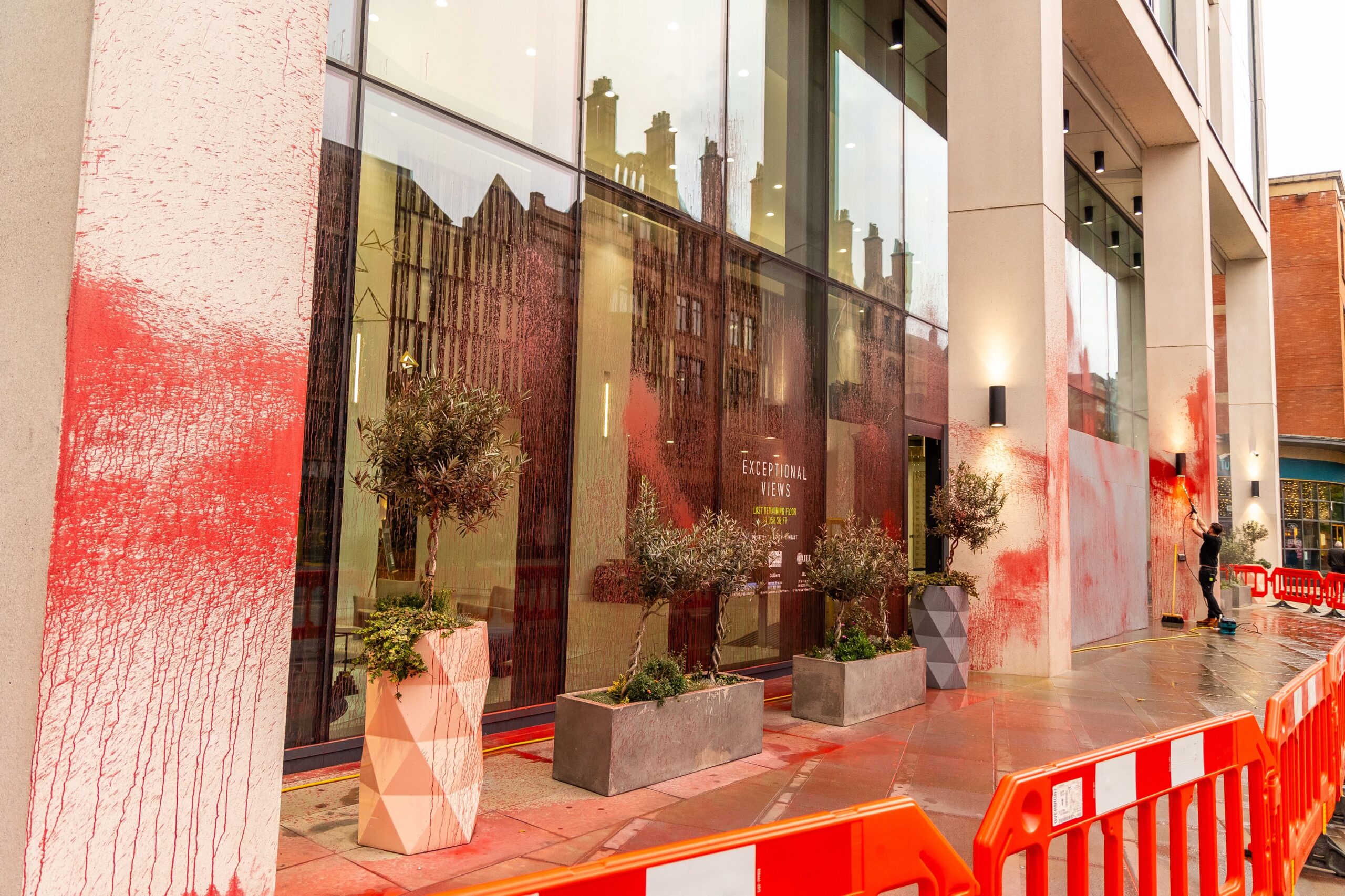 Red paint and “Drop Elbit” graffiti sprayed in coordinated actions against insurance firm