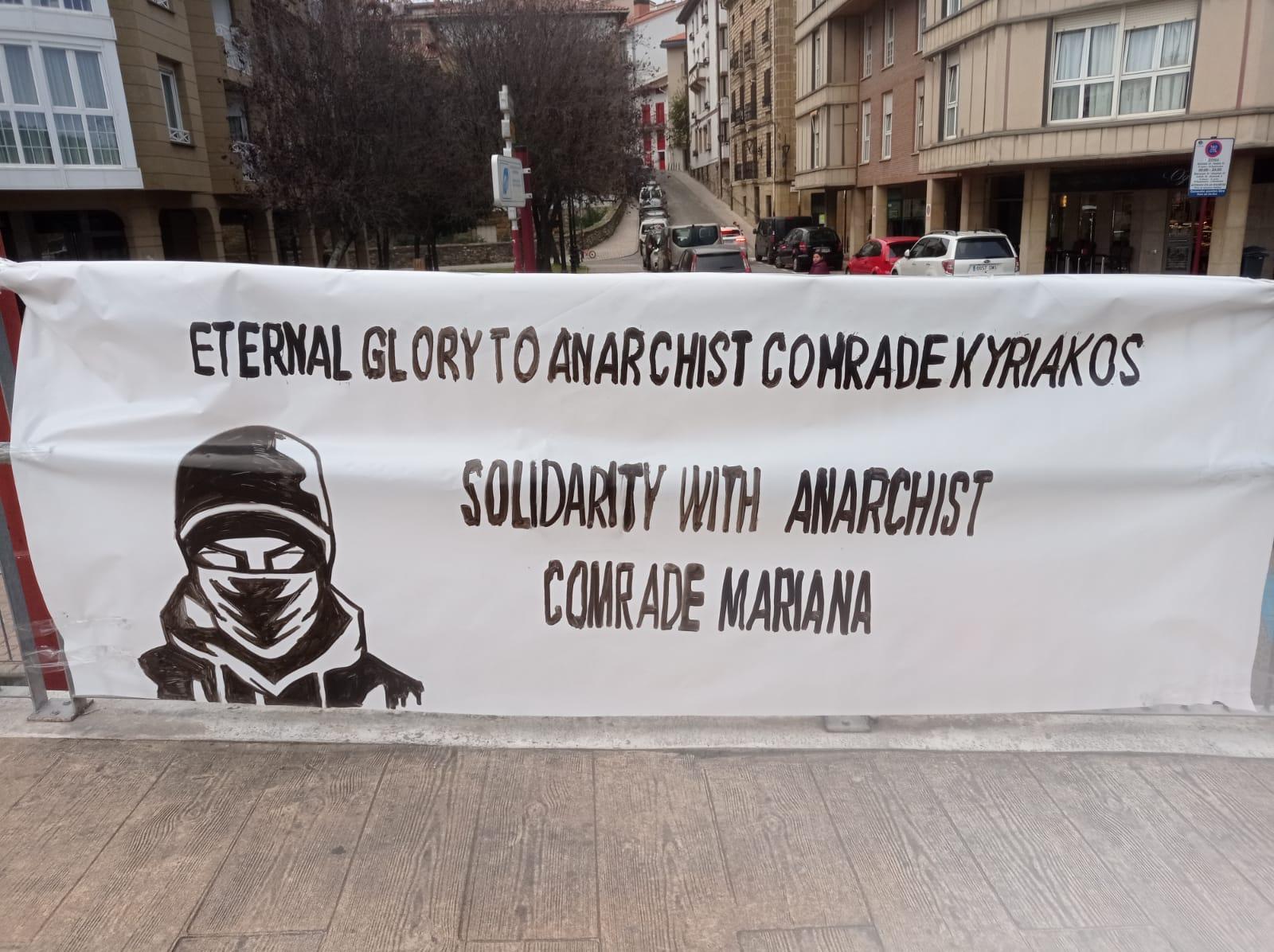 Solidarity actions also took place in London and Glasgow. In Rome, two people were arrested and fined for dropping a solidarity banner in front of the Colosseum. Anarchists across the Iberian peninsula have also dropped banners in memory of Ximitiris. In Hamburg, several dozen angry people marched unannounced and masked through the St. Pauli district. Slogans were sprayed, fireworks set off,and an office of the ruling Social Democratic party was attacked. A convergence of insurrectionary cells in Chile have written a letter to Kyriakos and Marianna titled “A death in action is an eternal call to struggle“.