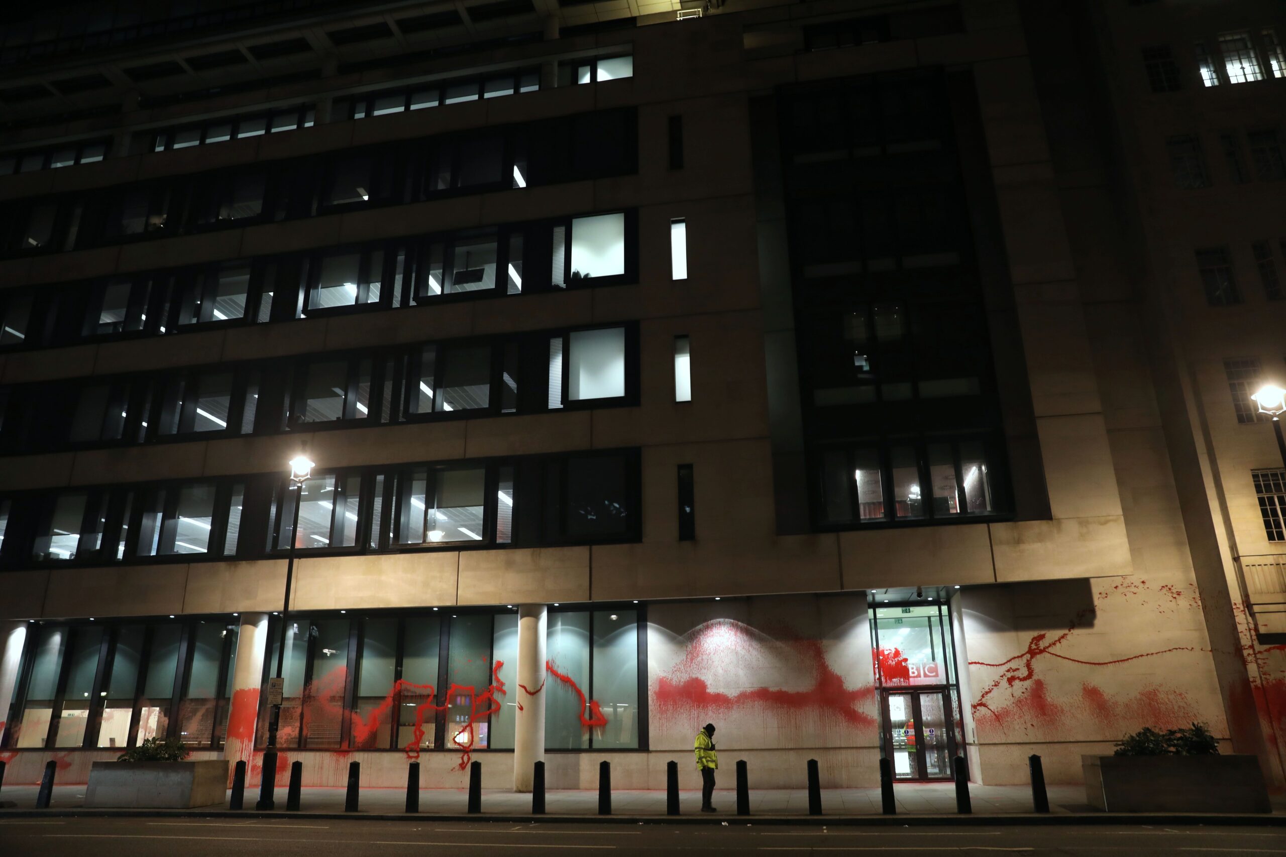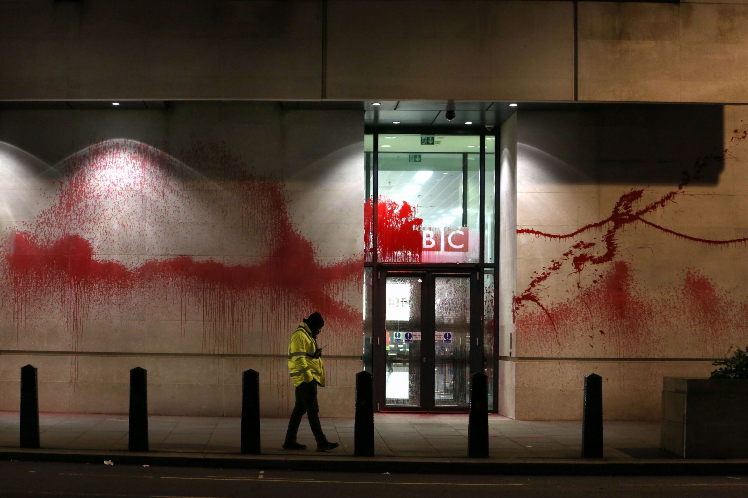 Palestine Action said its activists early today (17 February) targeted BBC’s headquarters in Portland Place, London, covering the outer ground floor in blood-red paint and breaking windows. The group blamed the BBC for “downplaying Israeli war crimes” while failing to “provide a platform for Palestinian voices”, making it “complicit in the genocide unfolding in Gaza”. This is the second time the group targets the building.