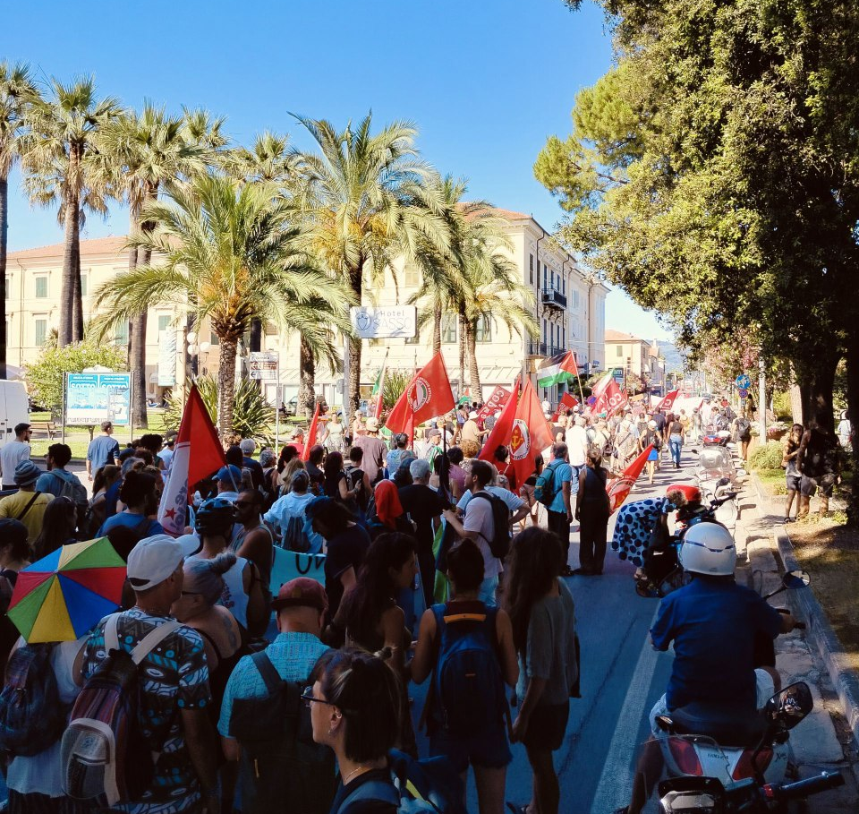 A protest of over 500 people took place on Saturday 28 June in the small touristic coastal town of Diano Marina, where the government is planning a new detention centre for migrants. Marching from the pier along the coast, the demonstration finished just outside the abandoned military compound where the detention centre is to be sited. Slogans included “No borders, no nation, stop deportations” and “Revolt and evasion”.