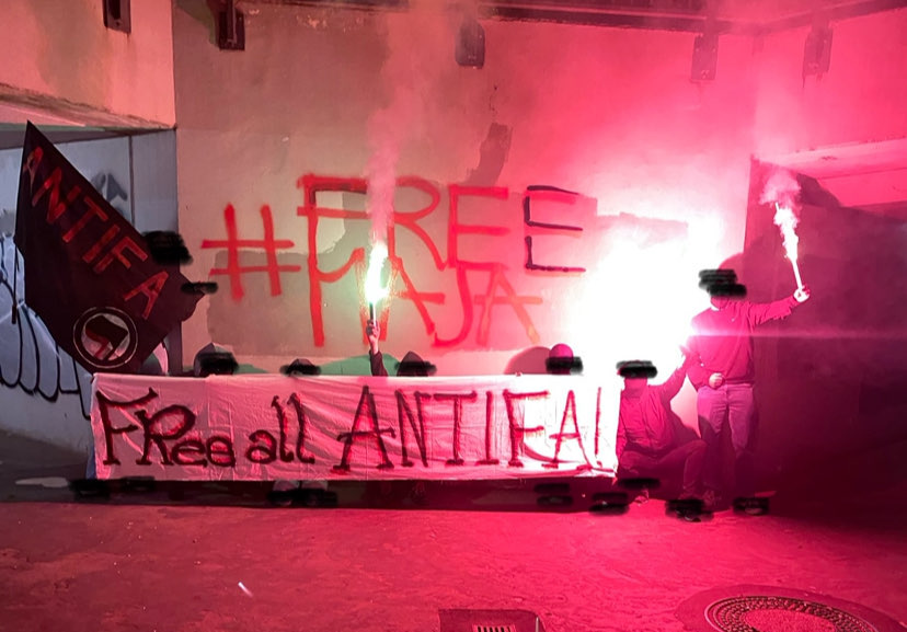 Solidarity actions with Maja T. have continued in the last week. An unannounced demonstration on 10 July moved through Hamburg’s trendy Schanzenviertel district with slogans, pyro and smoke. Another spontaneous demonstration took place in Leipzig, where a few dozen anti-fascists set off fireworks and distributed leaflets in the Südvorstadt, attacking a Green Party office along the way. In Bern, activists unfurled a banner and turned a water hose on the German embassy.
